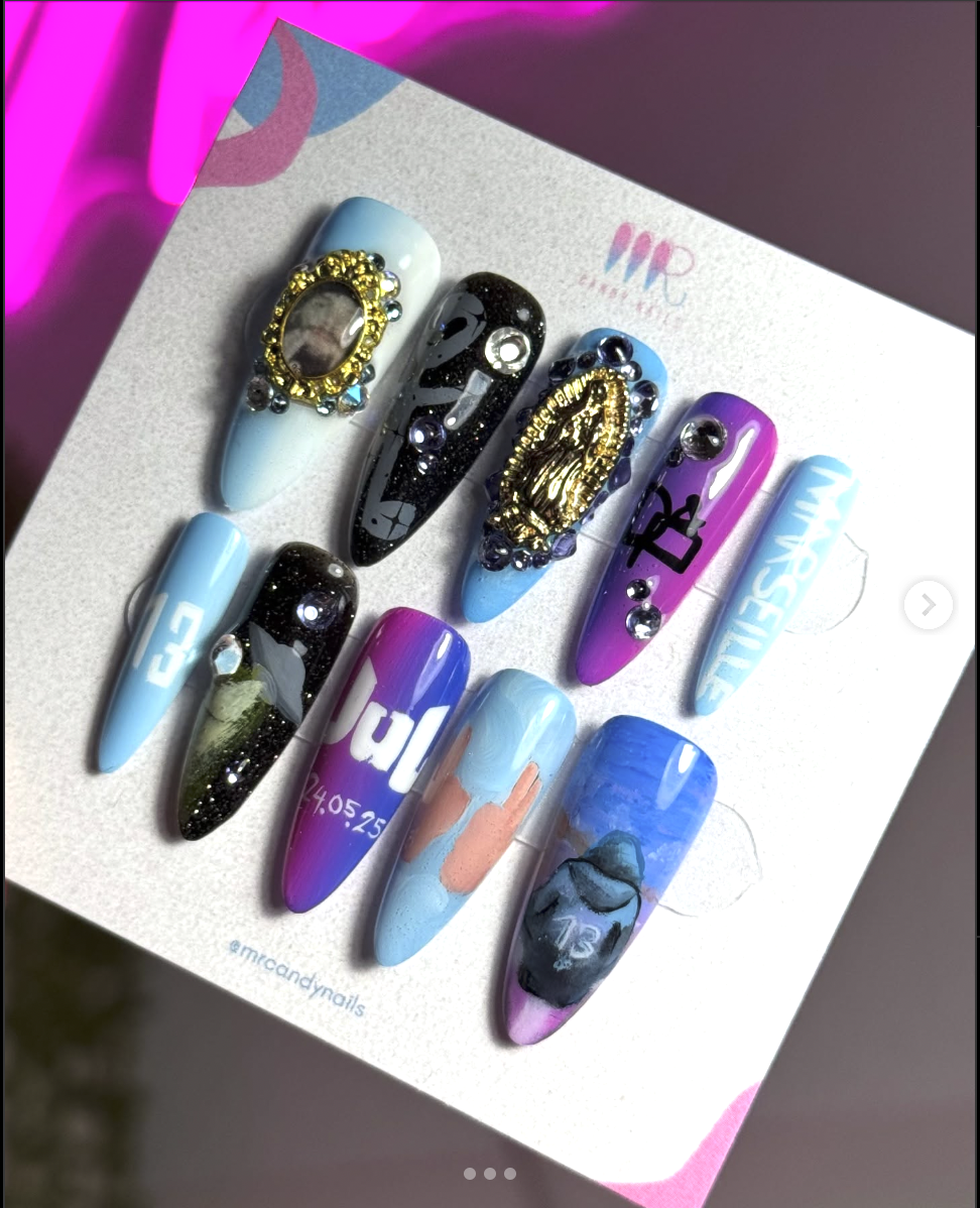Les artistes affirment leurs ongles à travers les pochettes d’albums, leurs clips, leurs photos… Leur nail art fait partie de leur branding et les américaines sont pionnières de ce mouvement. Le nail art permet une forte expression personnelle, autant dans le choix des couleurs que des motifs ou de la longueur des ongles. Chez les rappeuses c’est souvent un moyen de montrer leur puissance, leur confiance en elles, leur style assumé. Le fait de choisir des styles audacieux, parfois peu pratiques, renvoie à une forme d’affirmation : “je suis visible, je prends de la place”. Quand une rappeuse utilise un style de nail art marquant, cela influence les tendances dans la mode, la beauté, les réseaux sociaux. Le public essaie de reproduire les styles, les nail artists reçoivent plus de commandes inspirées “de…”. Le nail art devient un levier viral.